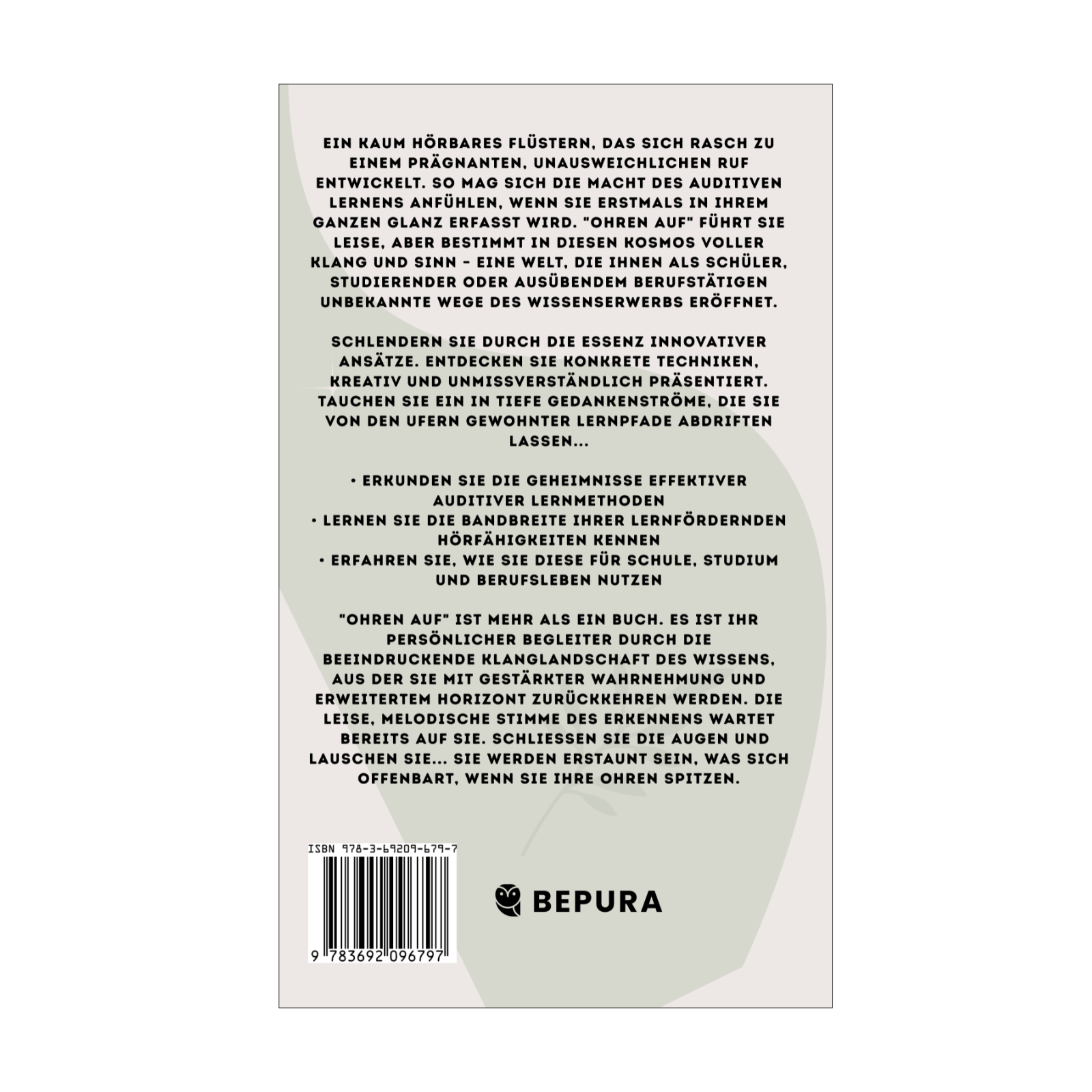 Dieses Buch hat das Ziel, Ihr auditives Lernen zu optimieren. Es bietet Ihnen einen innovativen, praxisnahen Ansatz, der Ihnen dabei hilft, Informationen besser durch Hören aufzunehmen und zu verarbeiten. Ganz gleich, ob Sie Schüler, Student, Auszubildender oder Berufstätiger sind, „Ohren auf“ bietet Ihnen wertvolle Techniken zur Verbesserung Ihrer auditiven Lernfähigkeiten in jedem Lebensbereich.